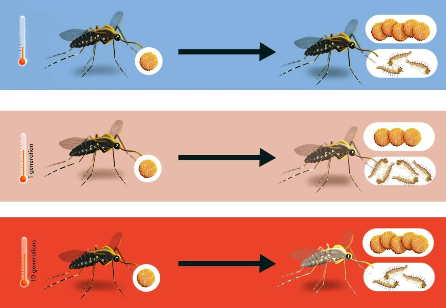 Banner and schematic for the Behind the Paper article "Warmer sicker? Or warmer stronger?: How climate change shapes mosquito immunity". The aim was to highlight how mosquito-virus interactions are influenced by temperature. Read it here